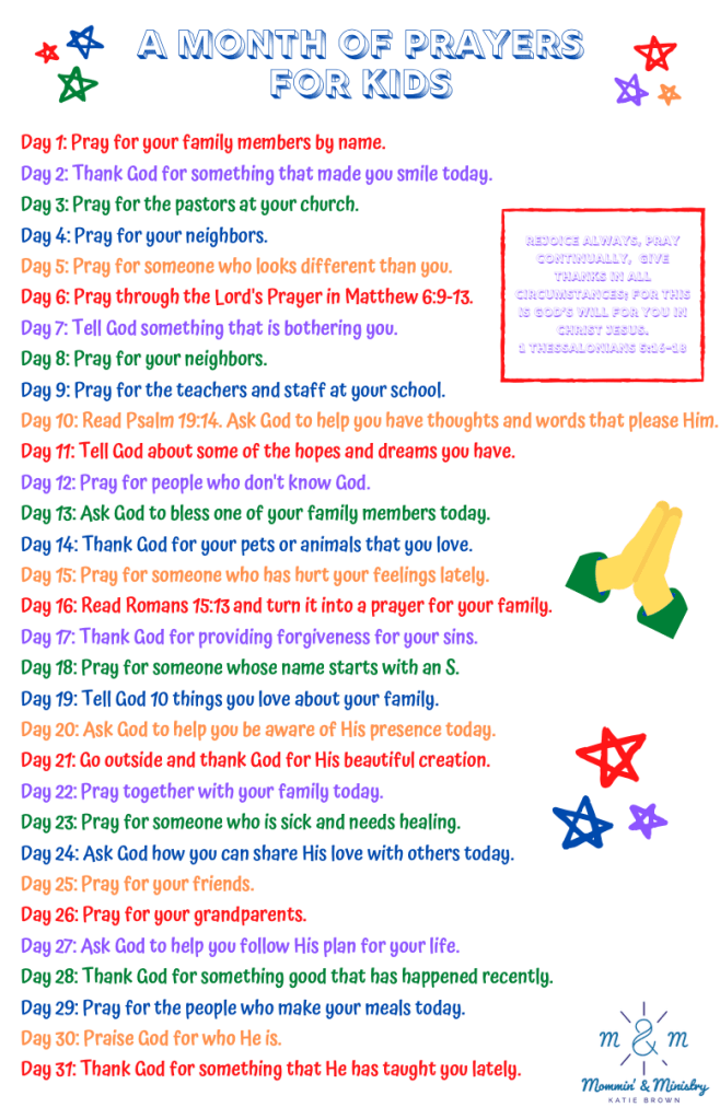 Resources Mother’s Day Activity PageDownload 1 John 4:8 Valentine’s Coloring PageDownload Weekly Prayer Log For KidsDownload 4th of July Coloring PagesDownload A Month of Prayers for KidsDownload God’s Top TenDownload Romans 1:16 Coloring PageDownload Share this: Click to share on Facebook (Opens in new window) Facebook Click to share on X (Opens in new window) X Click to email a link to a friend (Opens in new window) Email Click to print (Opens in new window) Print Like Loading...